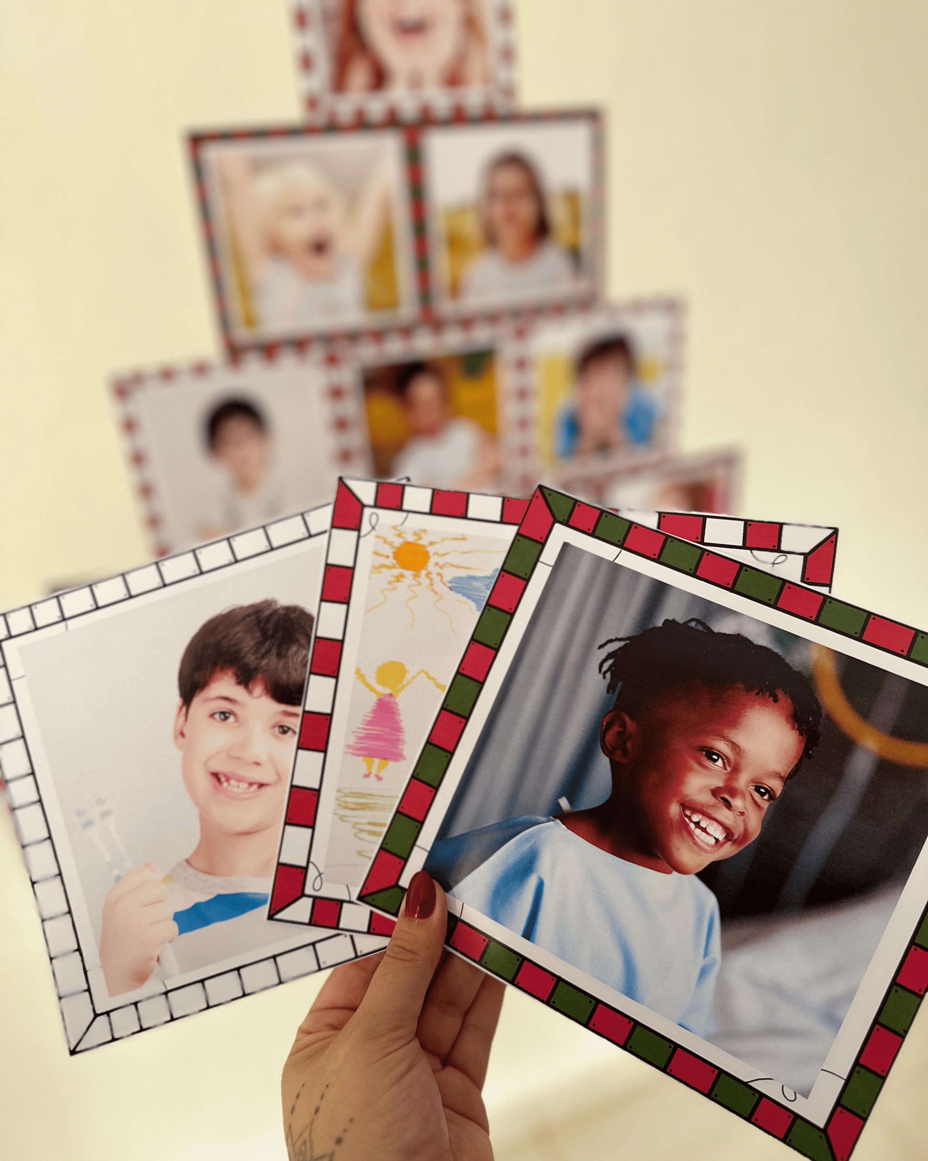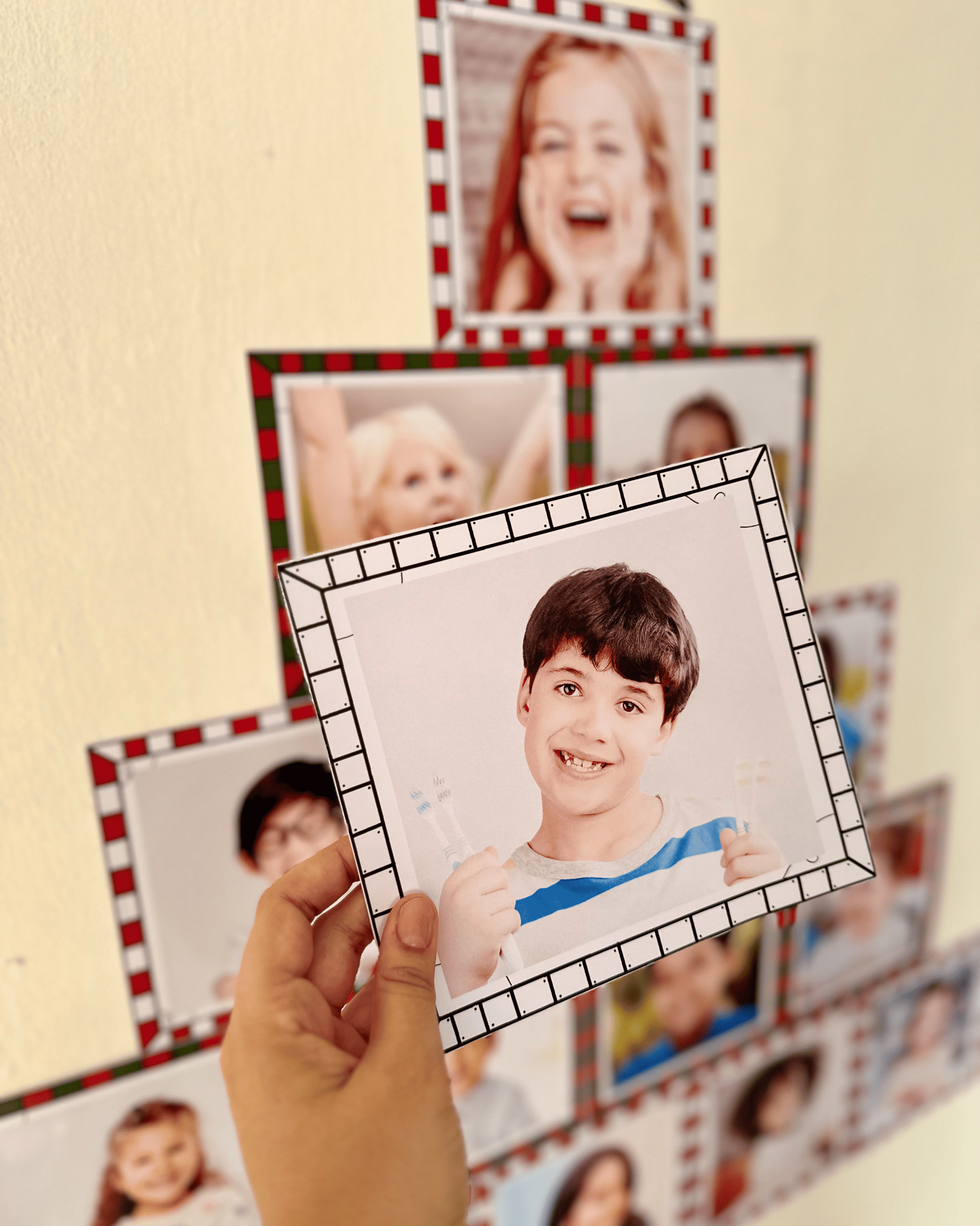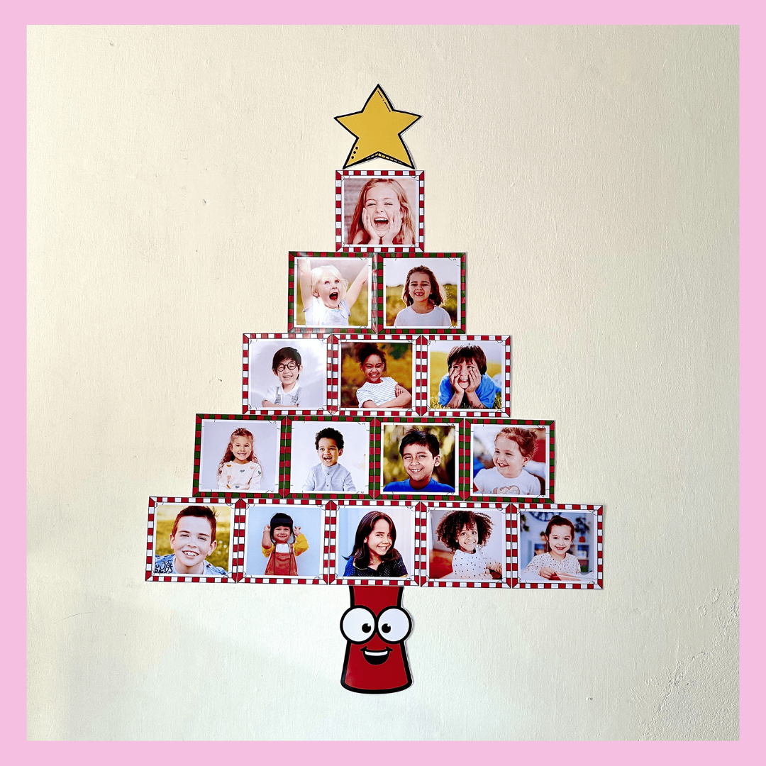 🤩 Mural de fotos em formato de árvore de Natal para decorar o ambiente escolar e tornar um espaço para recordações e alegrias.