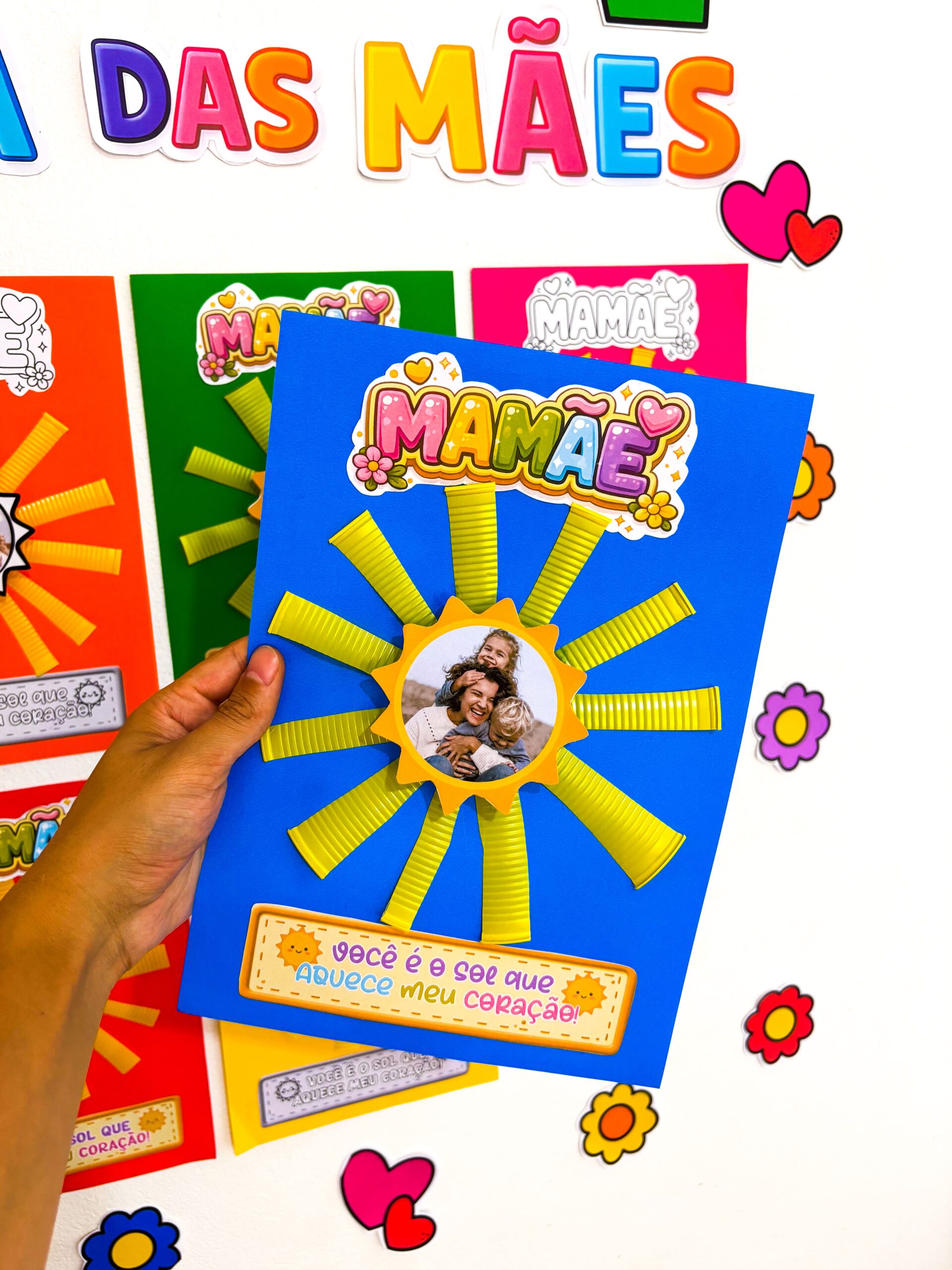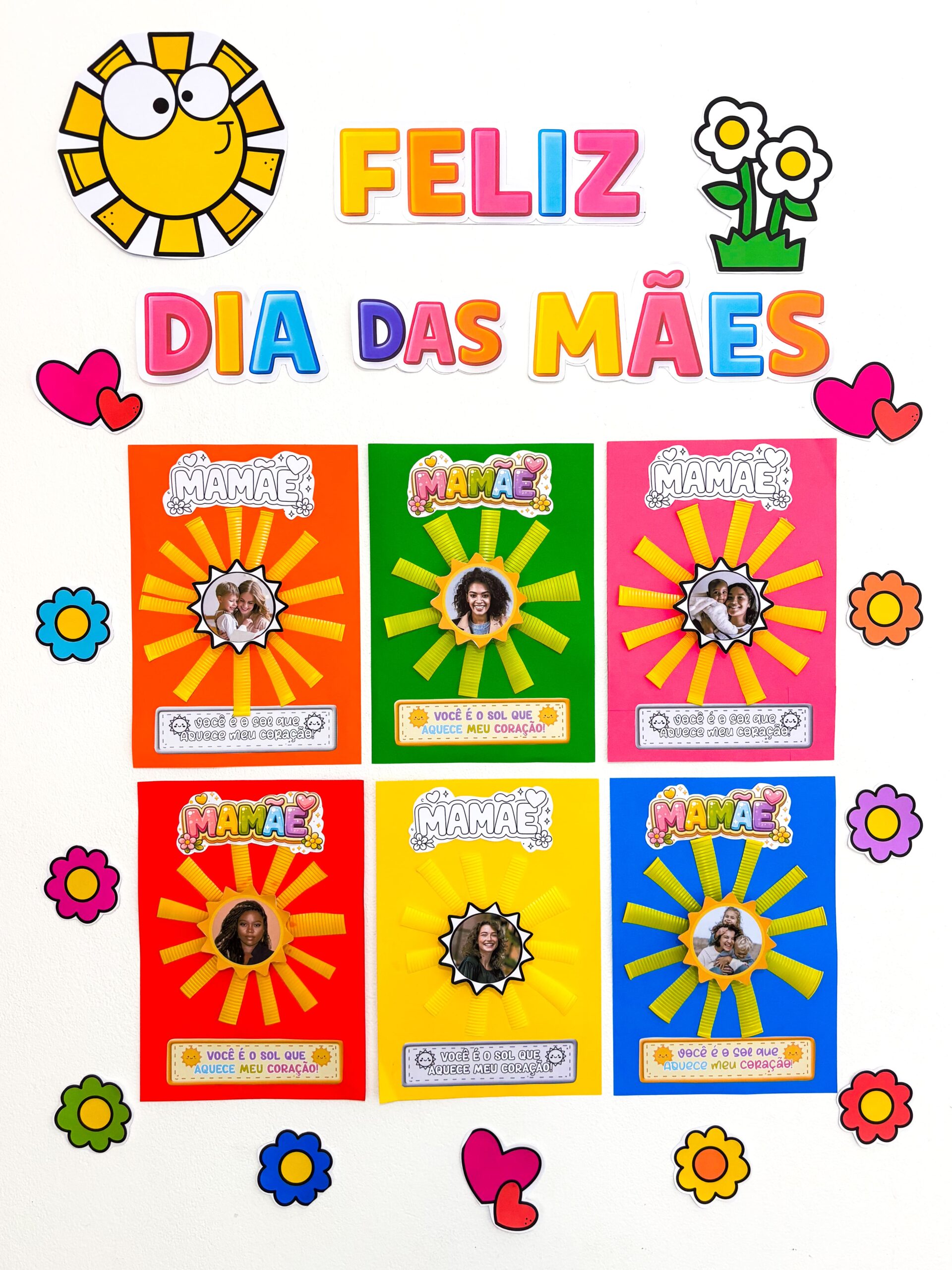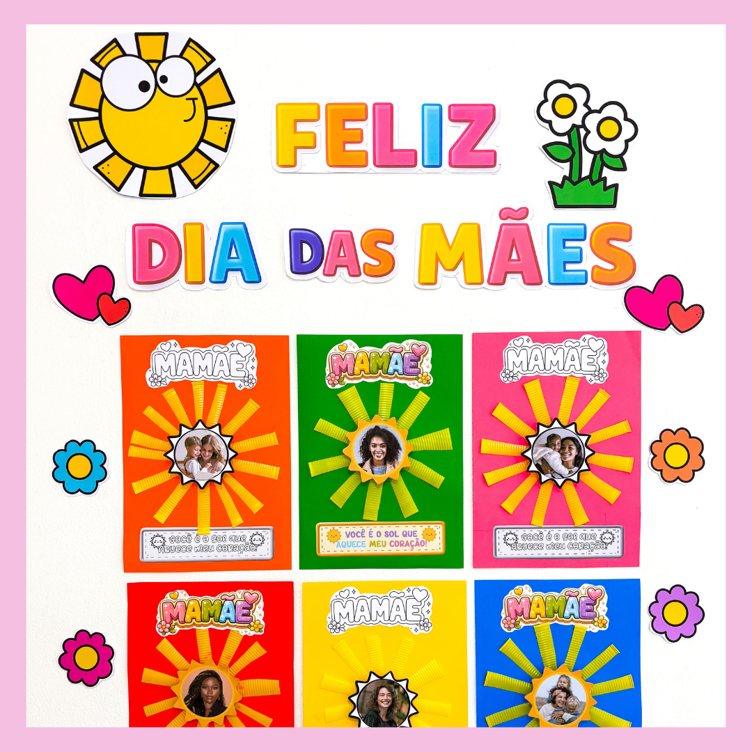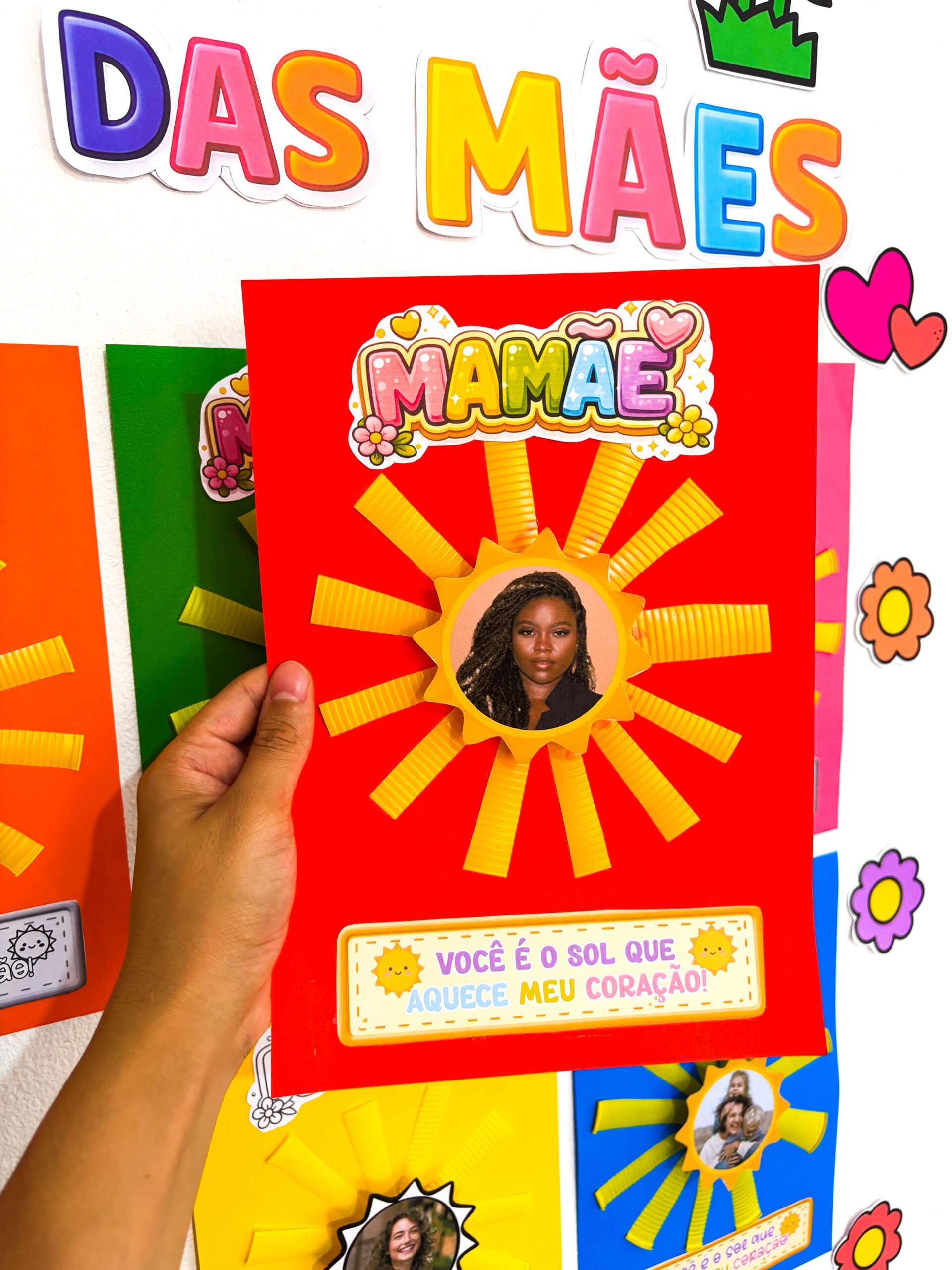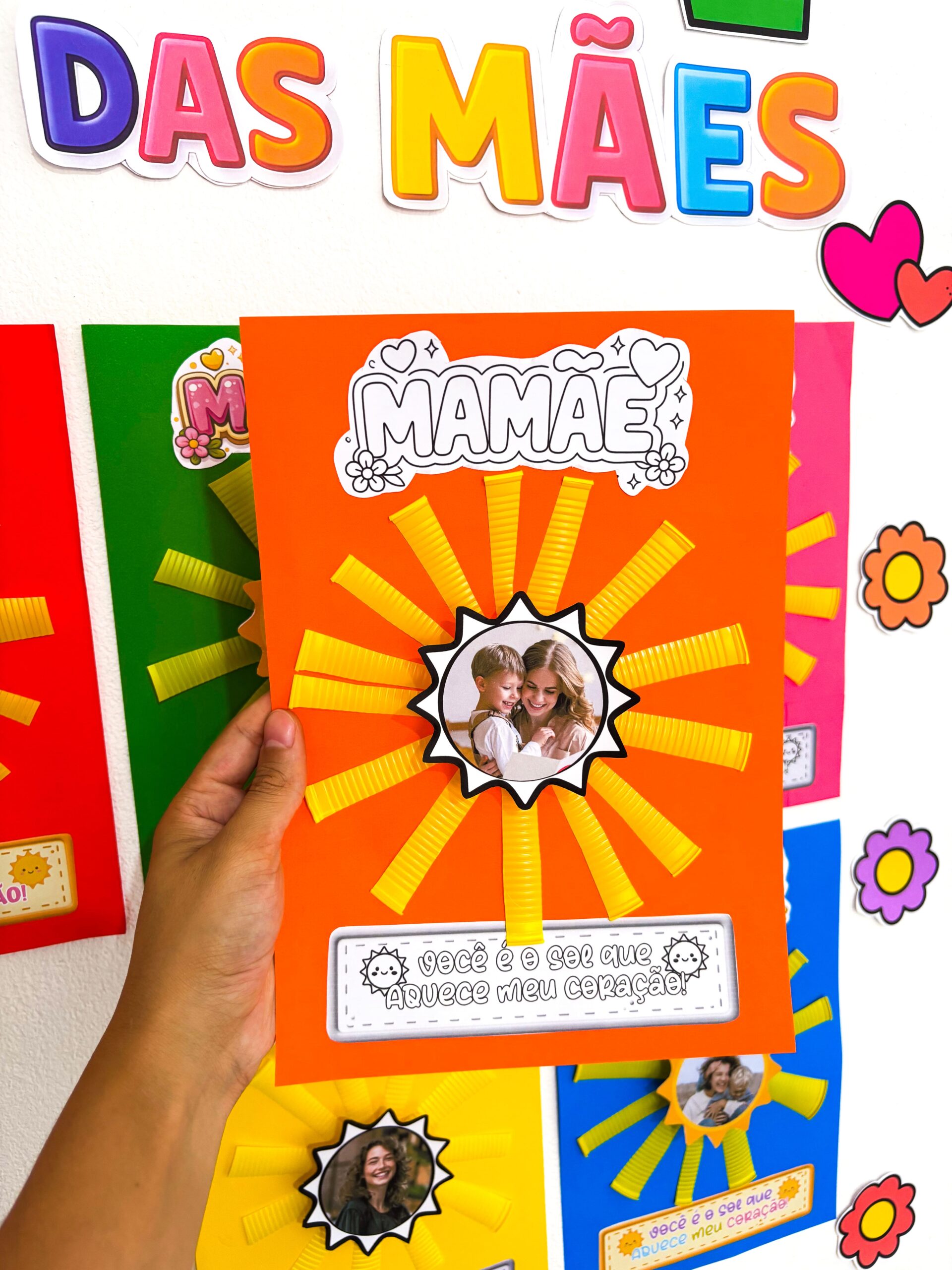 ✔️ Com a mediação da professora, as crianças colam os raios, o letreiro e a mensagem na folha… e no final, o resultado é simplesmente encantador: um lindo painel para exposição ou um cartão cheio de significado para presentear no Dia das Mães.