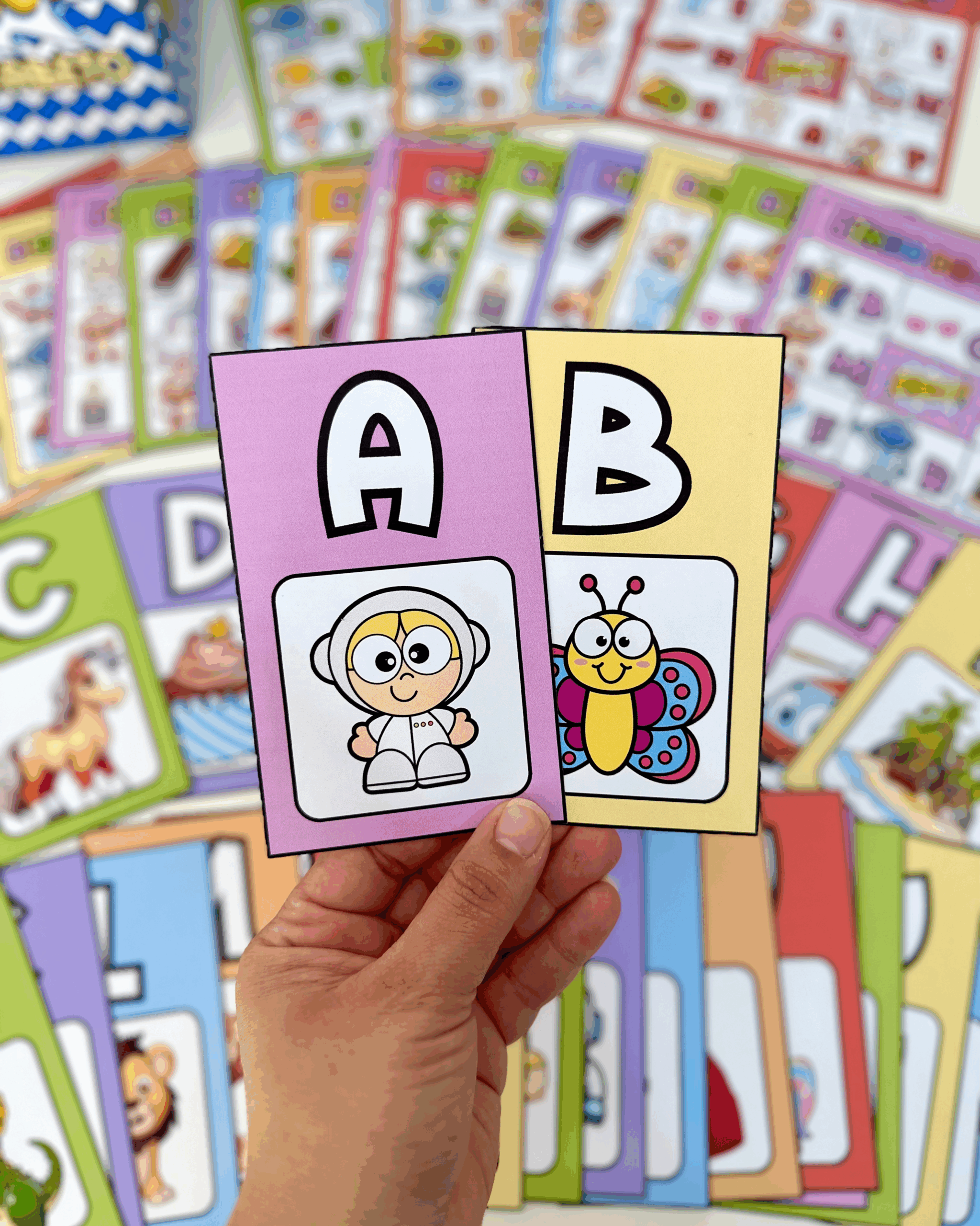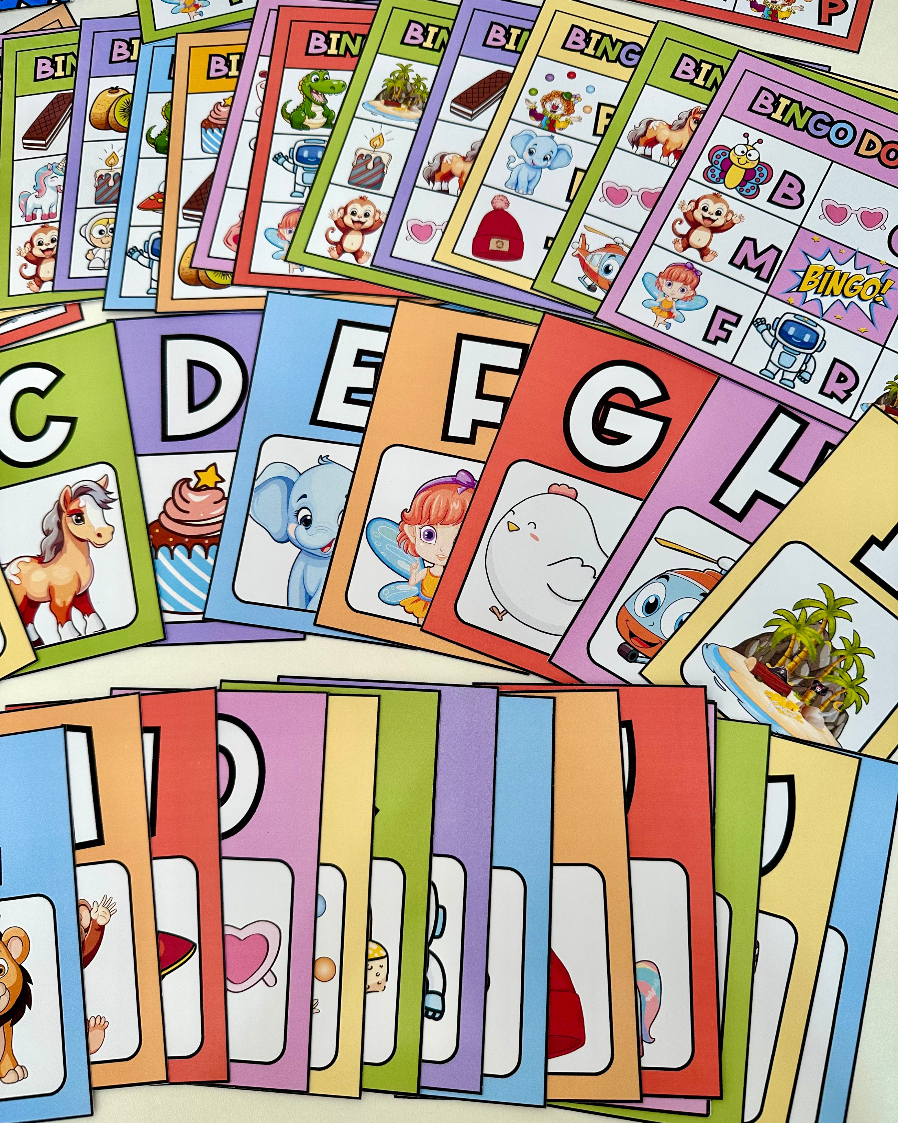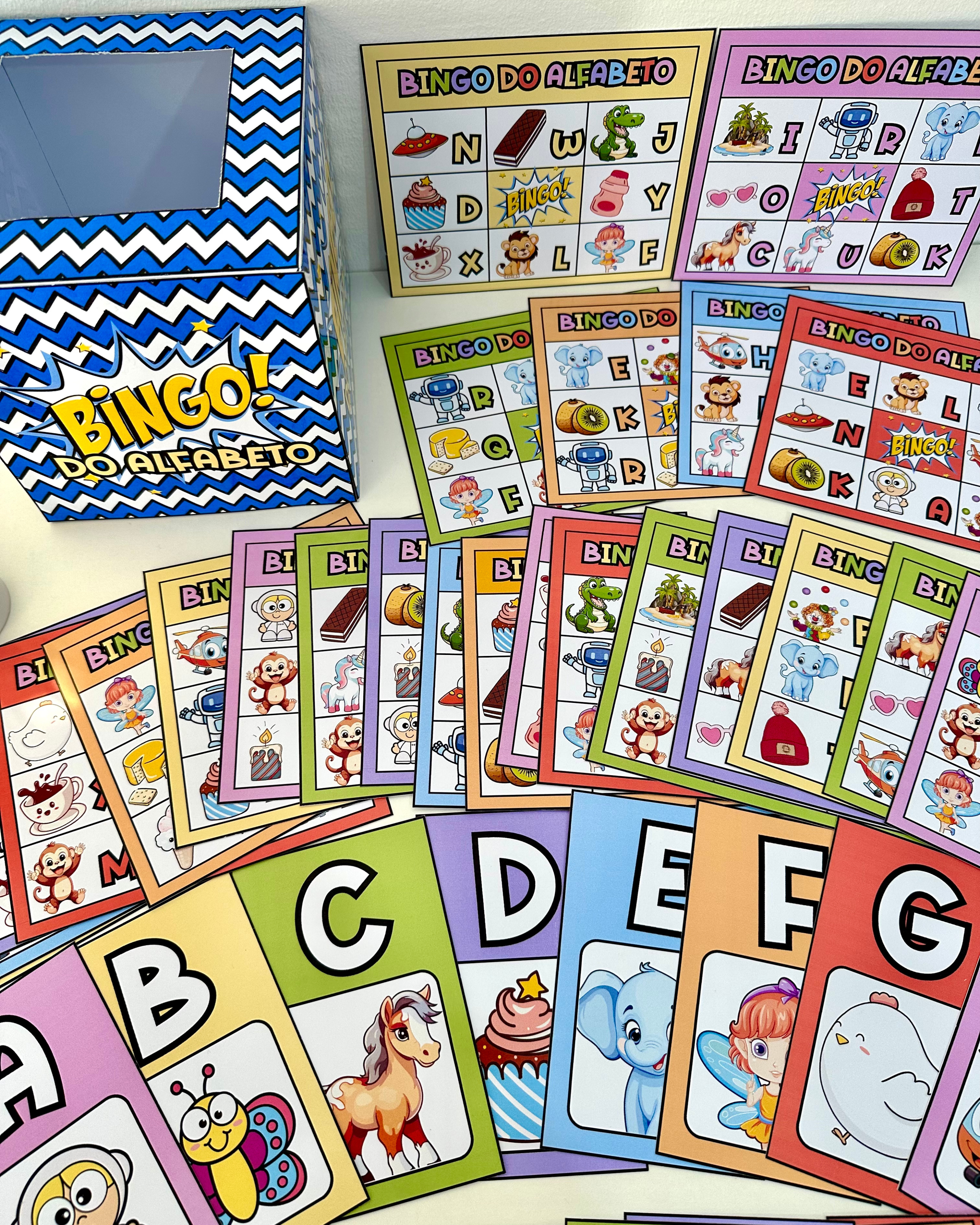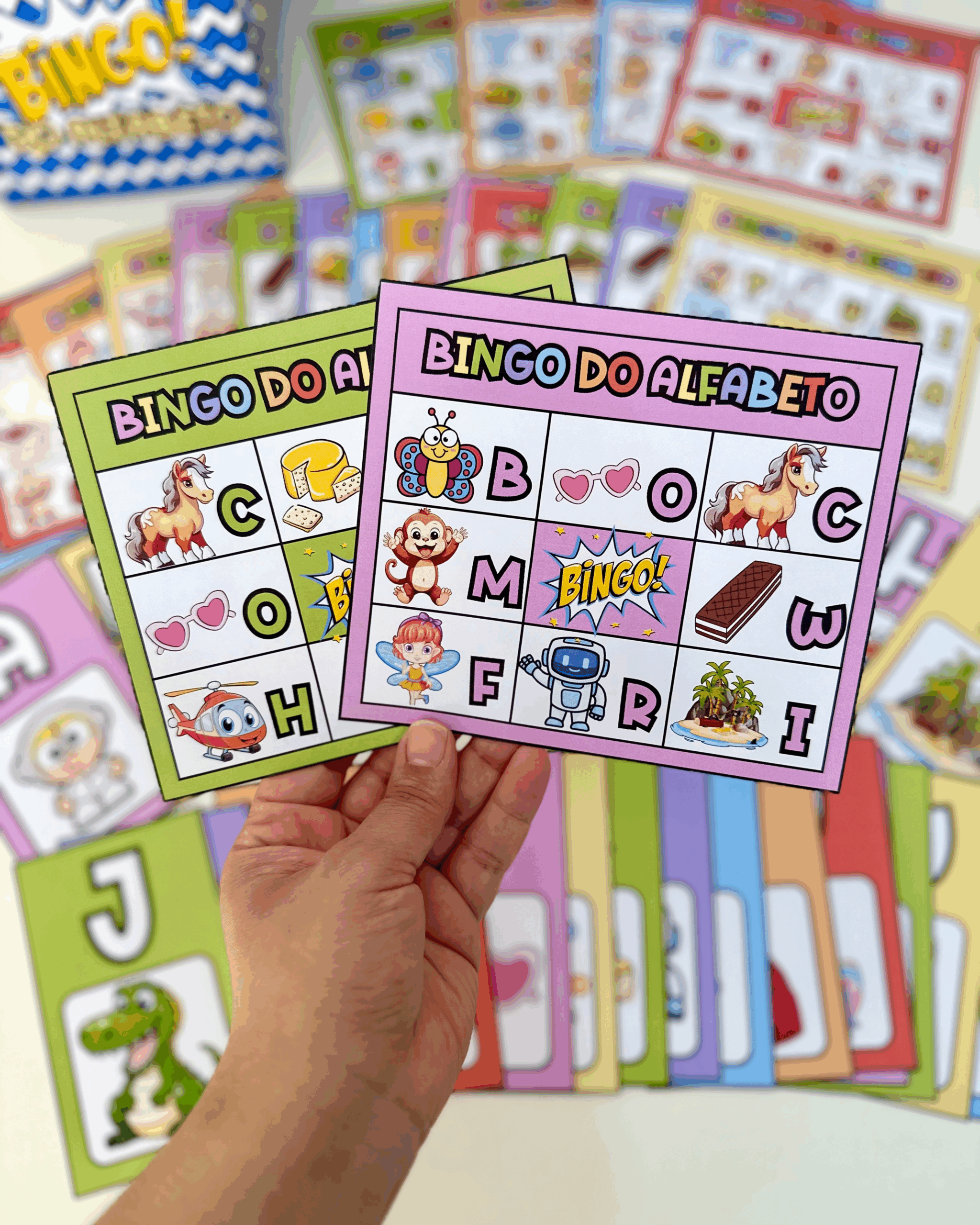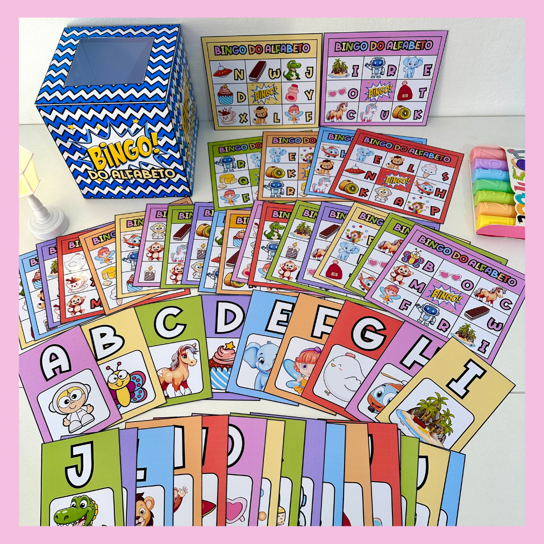 🤩 Bingo do Alfabeto com 24 cartelas diferentes e fichas ilustradas de todas as letras para sorteio.