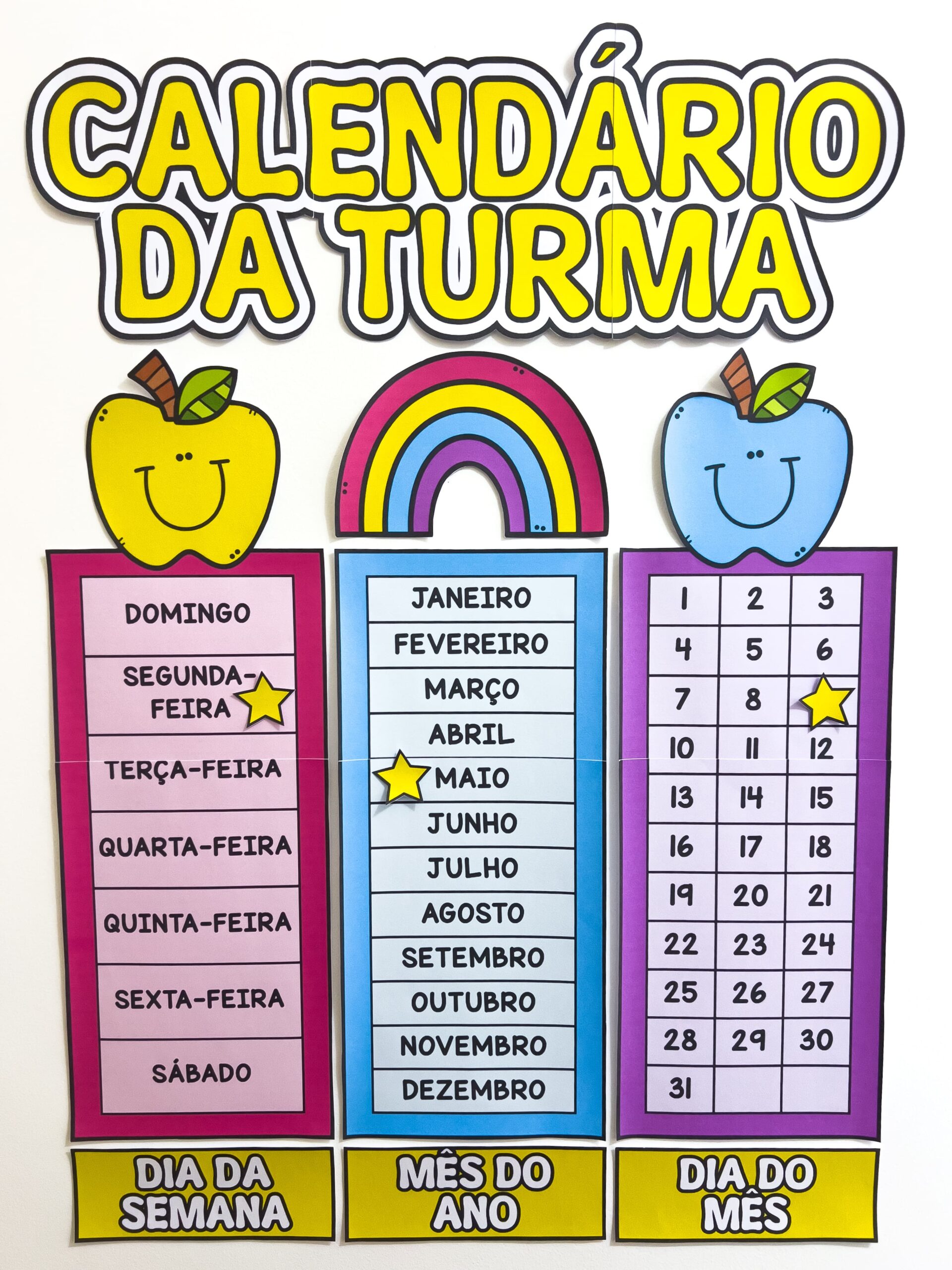 ✅ Conta com marcadores em formato de estrela, que podem ser movidos diariamente para indicar o dia correto, tornando o aprendizado mais dinâmico e participativo. O design lúdico, com cores vibrantes e elementos divertidos, desperta o interesse dos alunos e facilita a compreensão da noção de tempo.