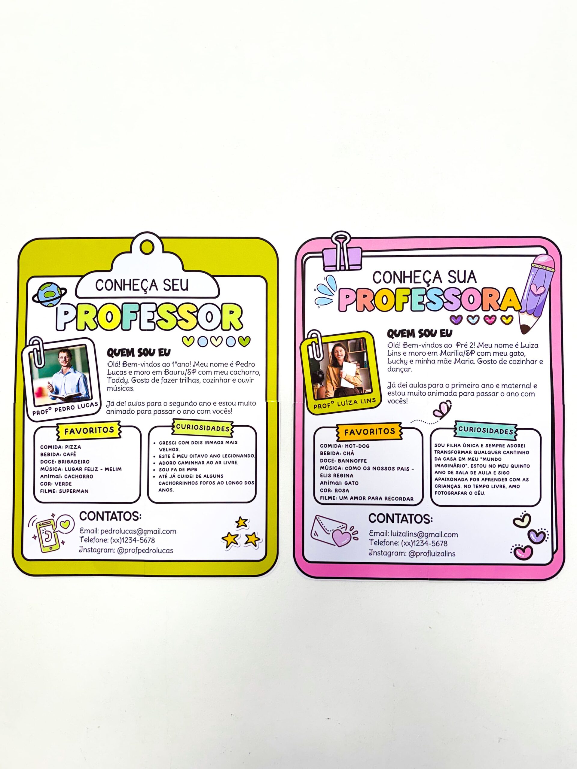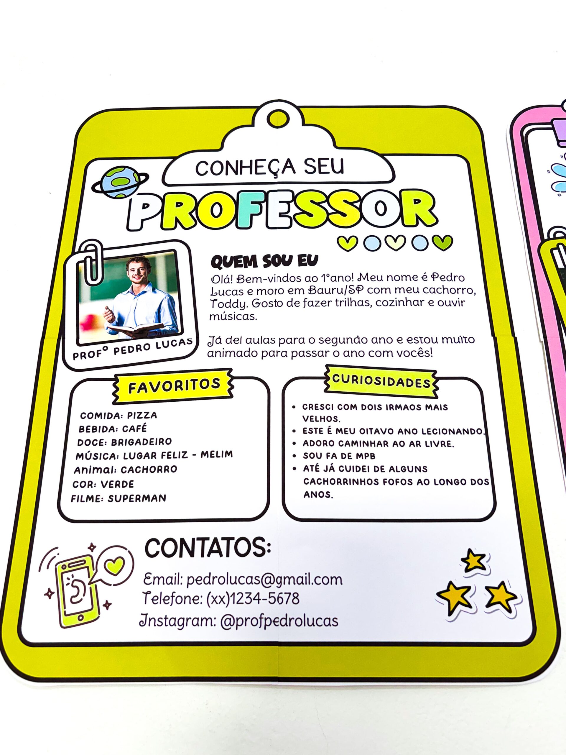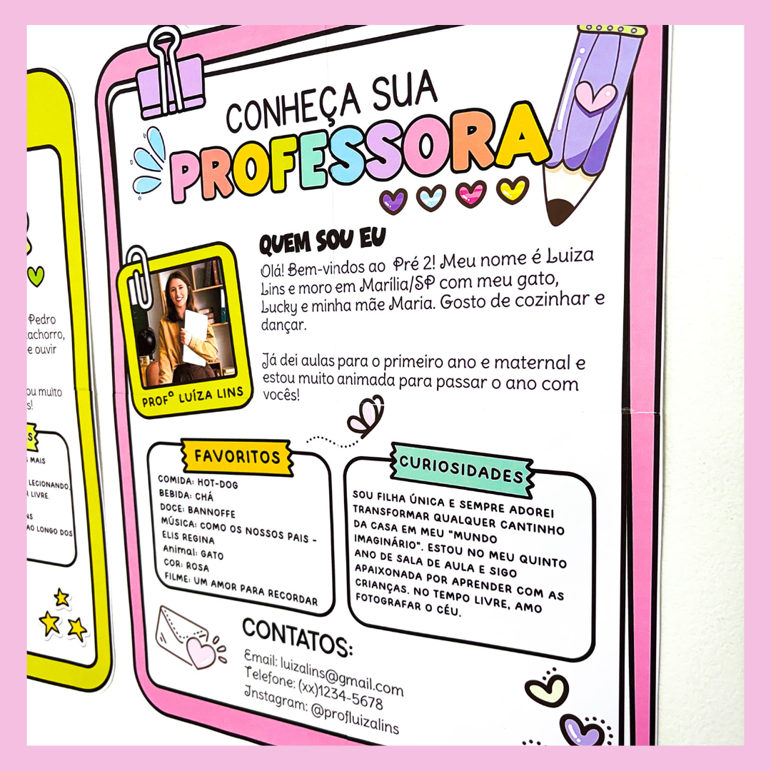 🥰 É um cartaz em formato de prancheta, editável, com espaço para foto e texto de apresentação, disponível nas versões professor e professora.