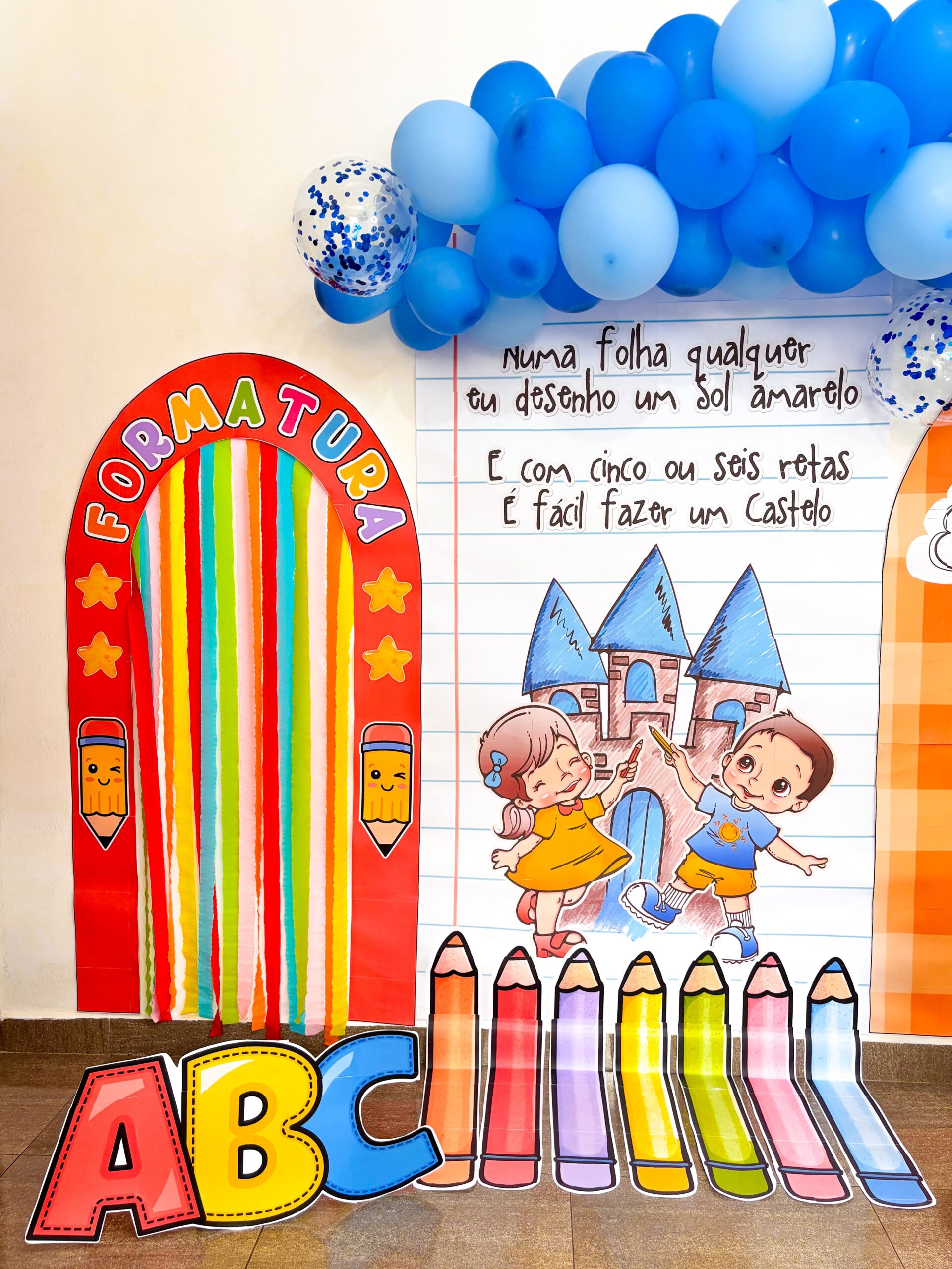 ✏️ No chão, os lápis coloridos e o tapete que completa o cenário tornam o espaço ainda mais envolvente, enquanto o arco de bexigas azuis adiciona um toque festivo e harmonioso.
