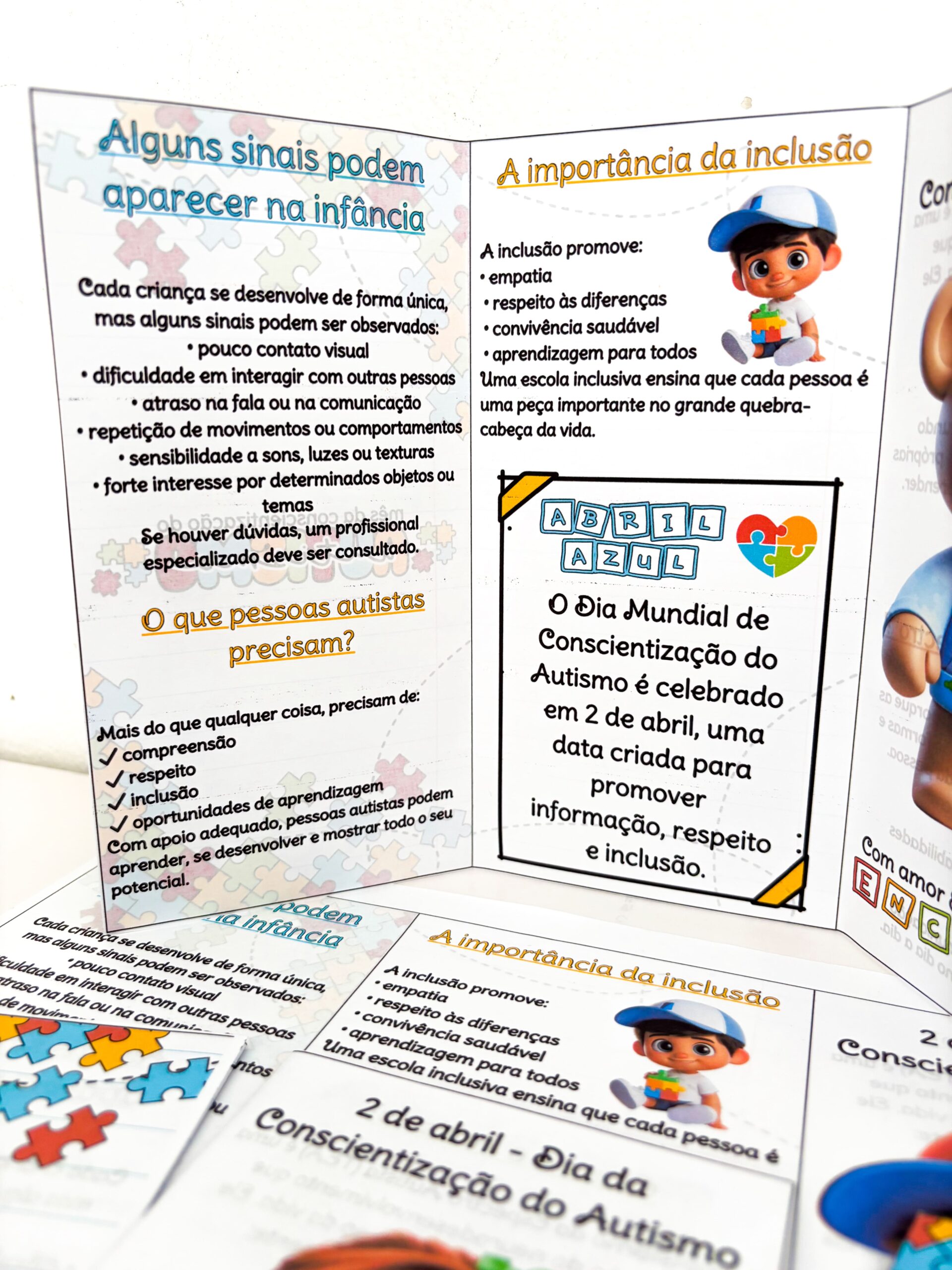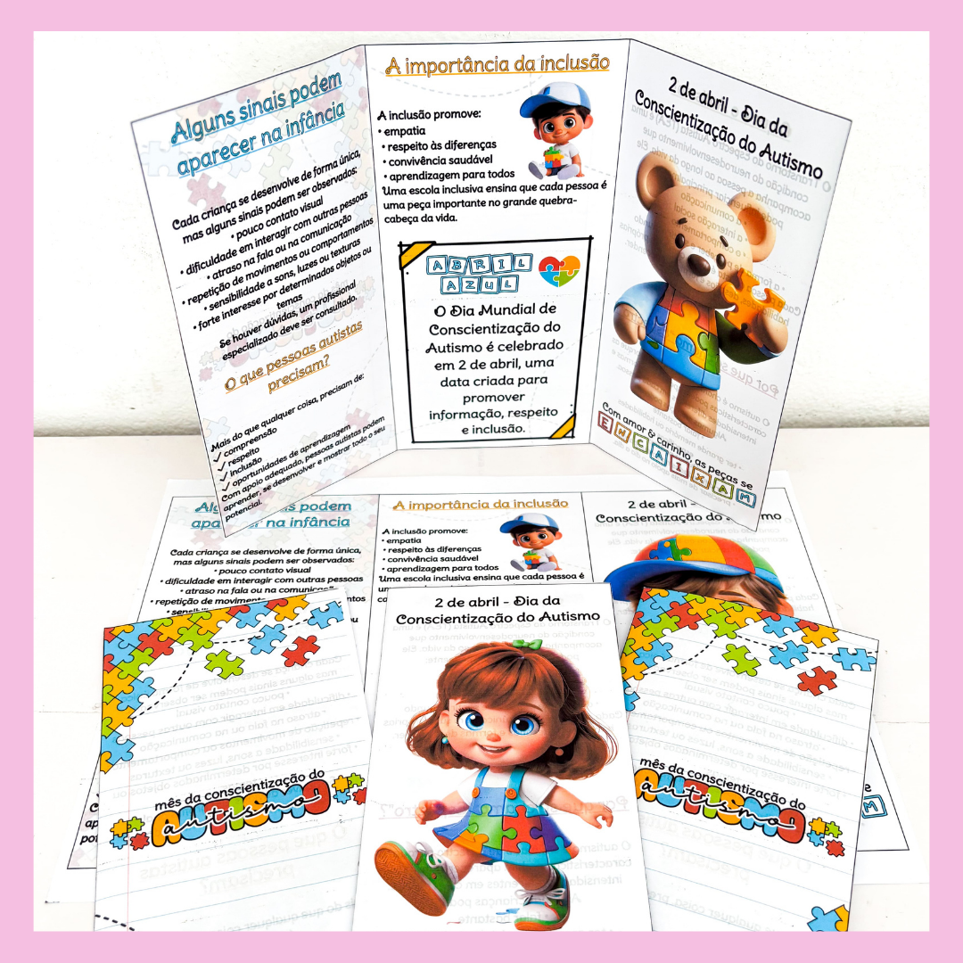 💡 O material traz informações claras sobre sinais que podem aparecer na infância, a importância da inclusão e o significado do dia 2 de abril, ajudando a ampliar o olhar sobre o autismo de forma acessível e acolhedora.