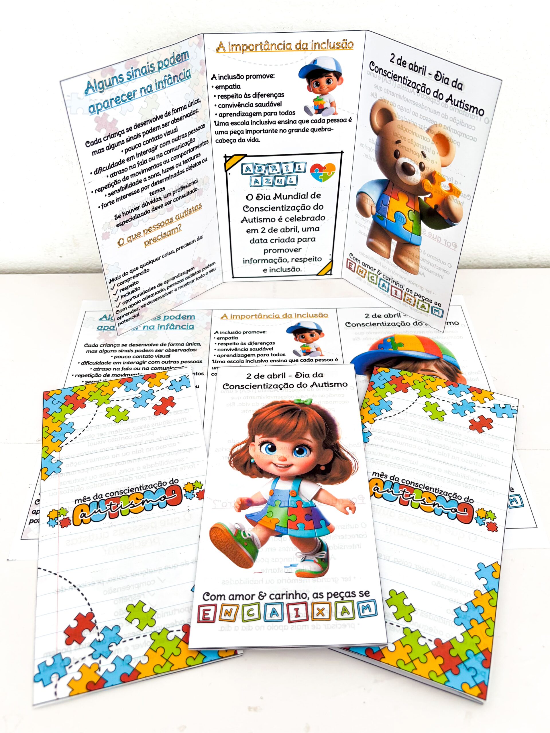 🧩🧩 Além disso, os folders têm visual infantil, colorido e cheio de elementos do quebra-cabeça, que representam a diversidade e a singularidade de cada criança.
