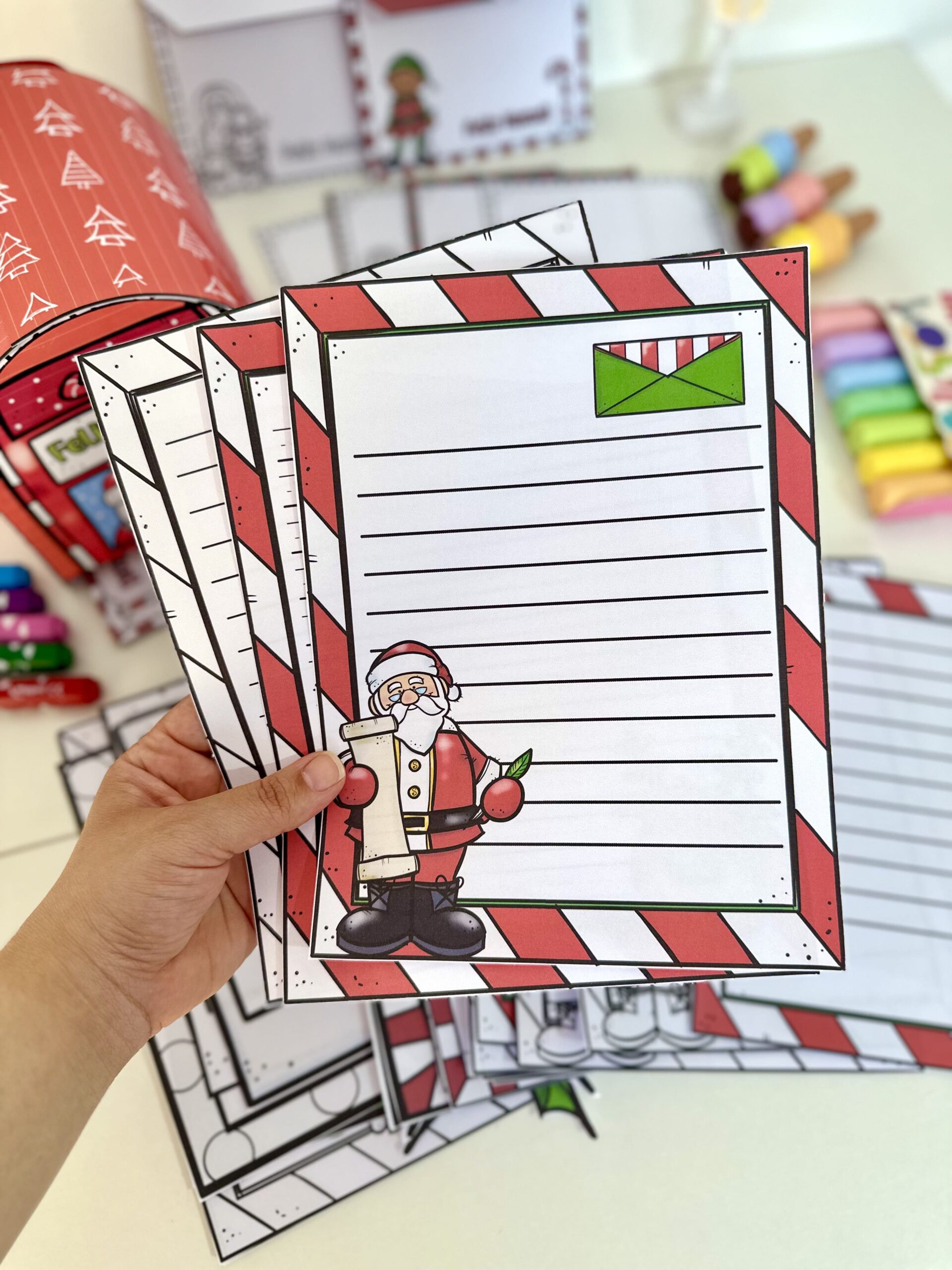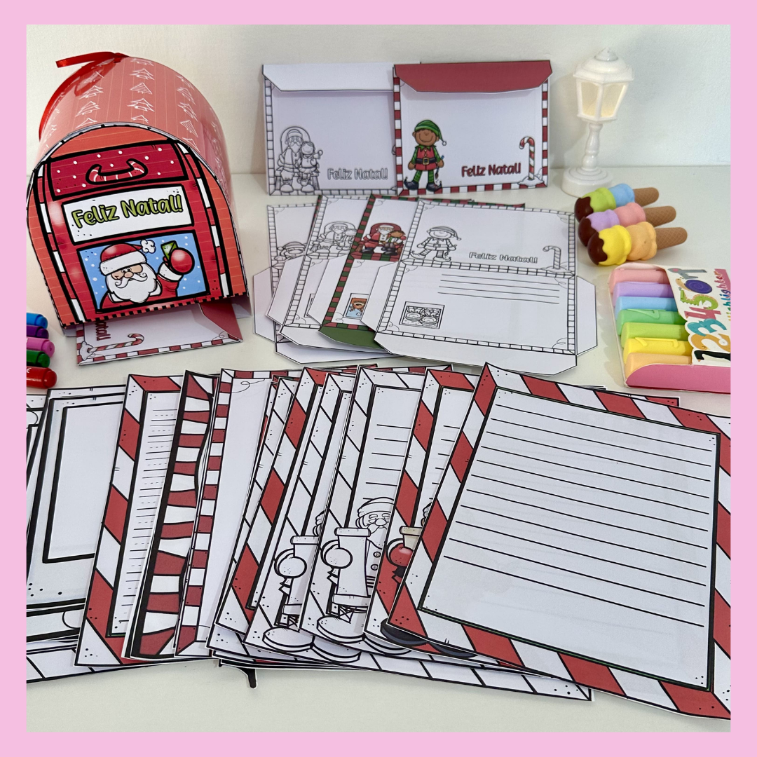 ✅ O material inclui opções de folhas para cartas, envelopes e também inclui uma caixinha em formato de Correio para cartas.