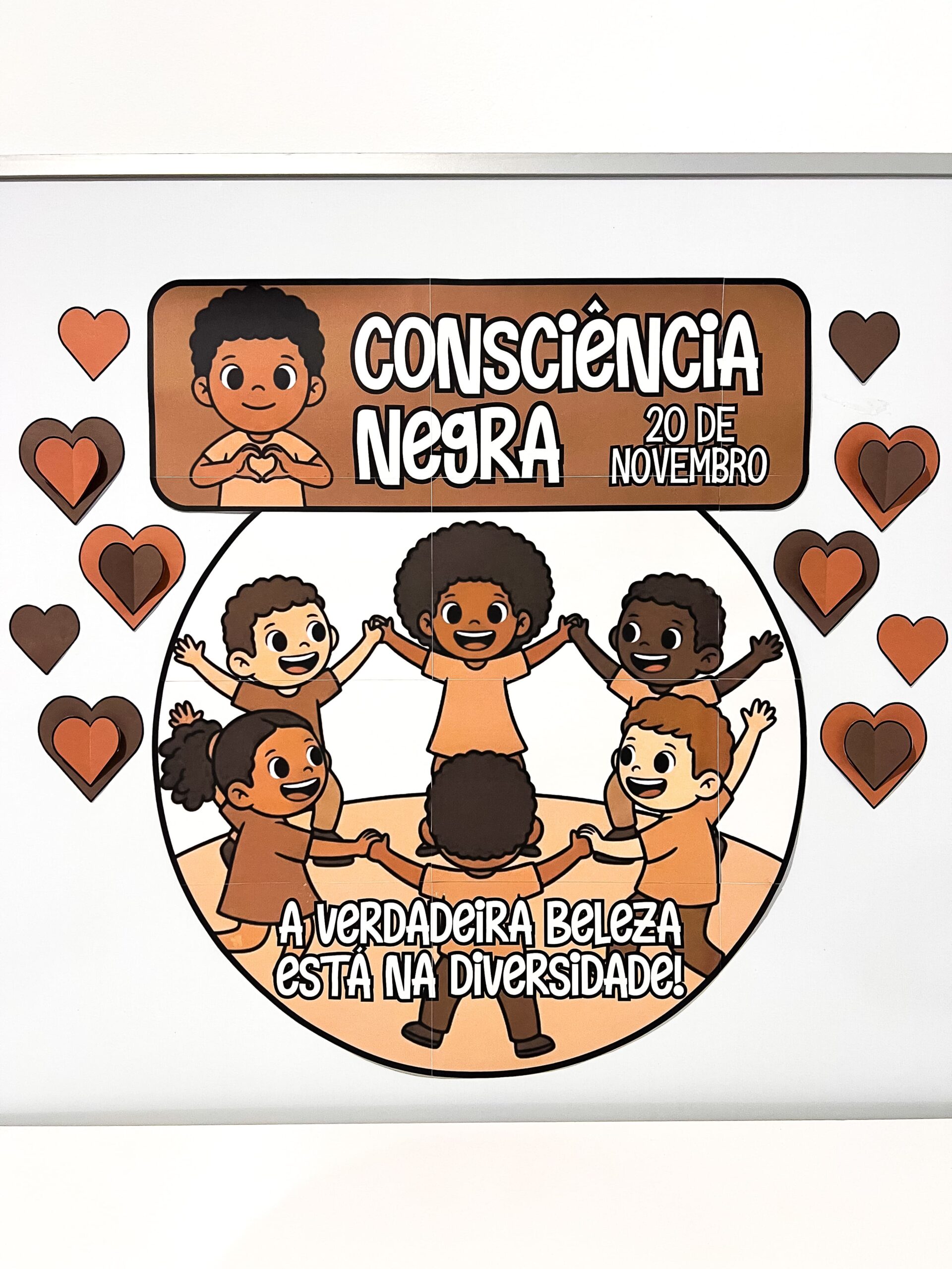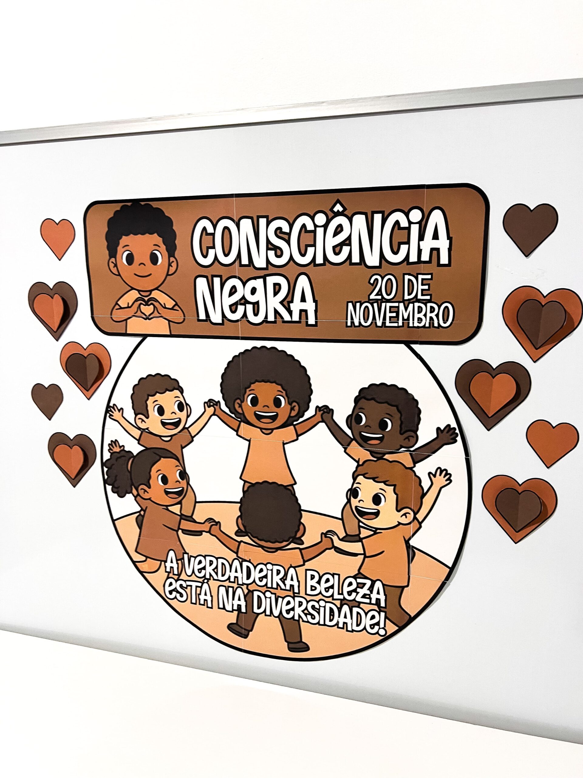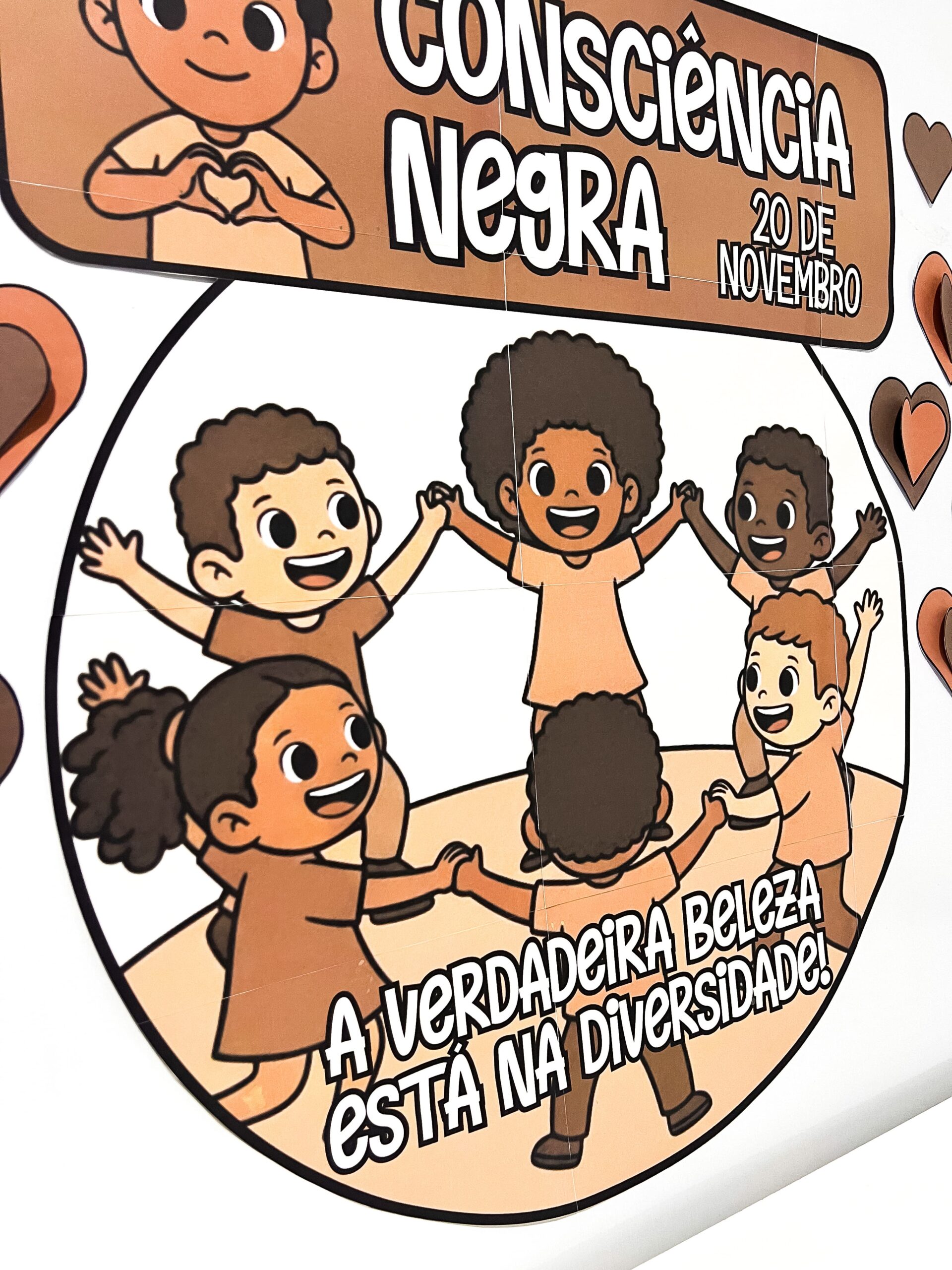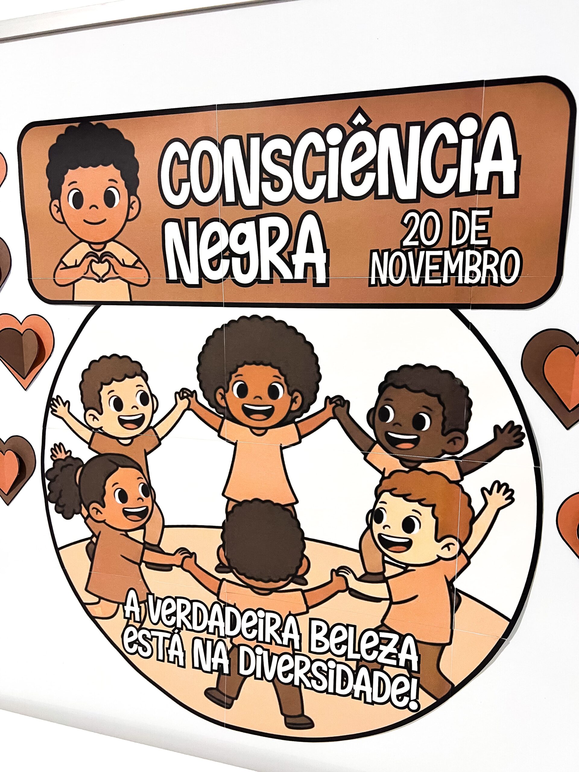 🖐🏾 O painel apresenta ilustrações de crianças de diferentes tons de pele, de mãos dadas em círculo, simbolizando união, respeito e valorização da diversidade racial.