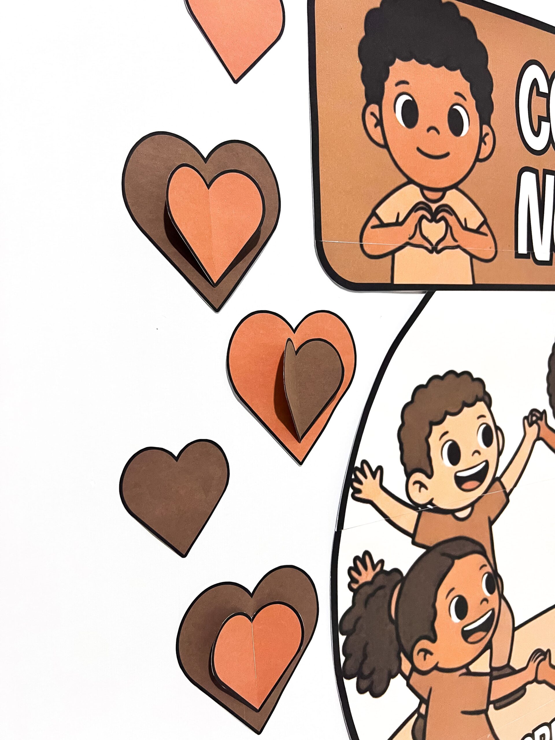 🥰 As cores predominantes remetem aos tons de pele e a representatividade étnica, tornando o painel ideal para decoração escolar, rodas de conversa e projetos temáticos voltados à conscientização sobre o respeito e o combate ao racismo.