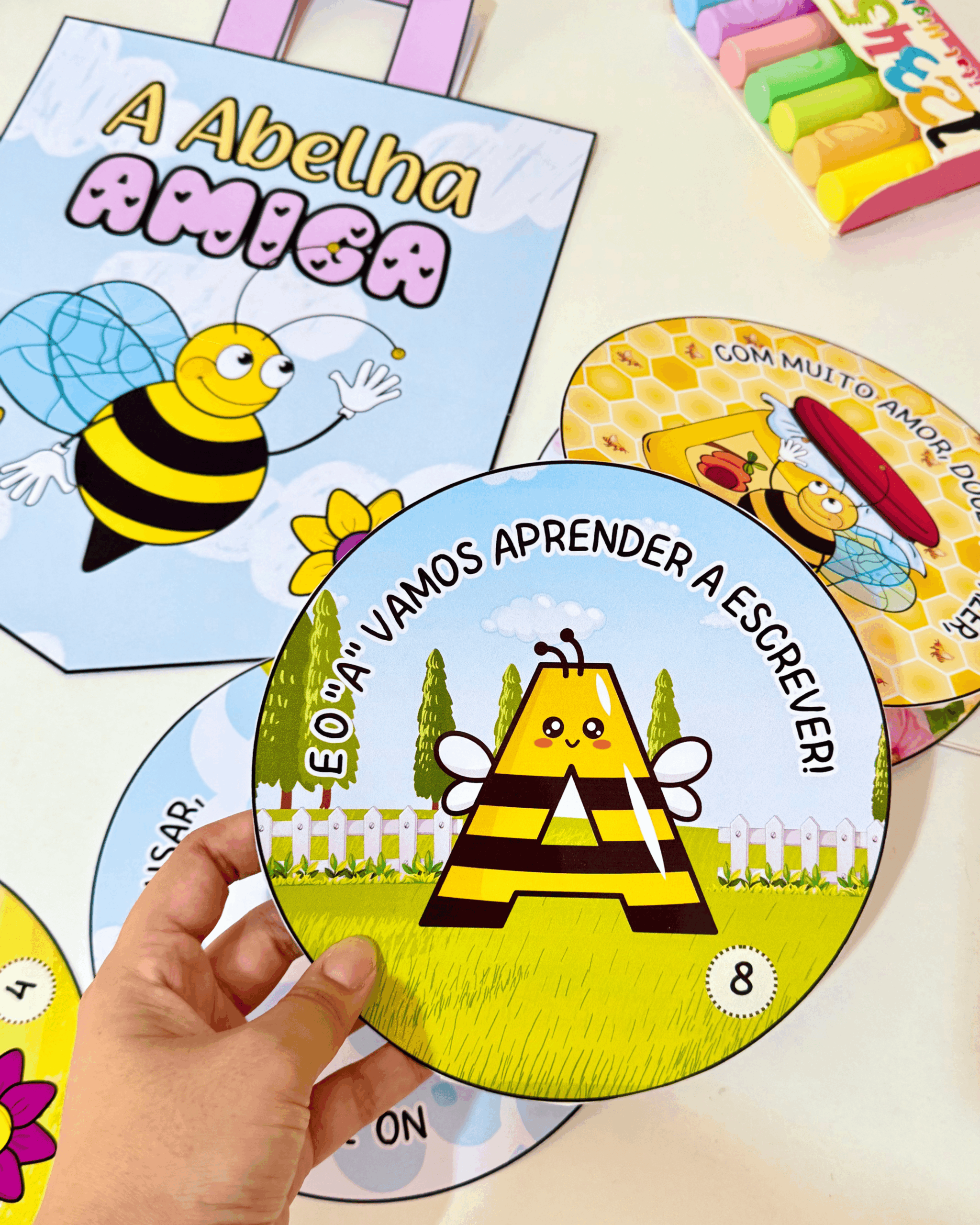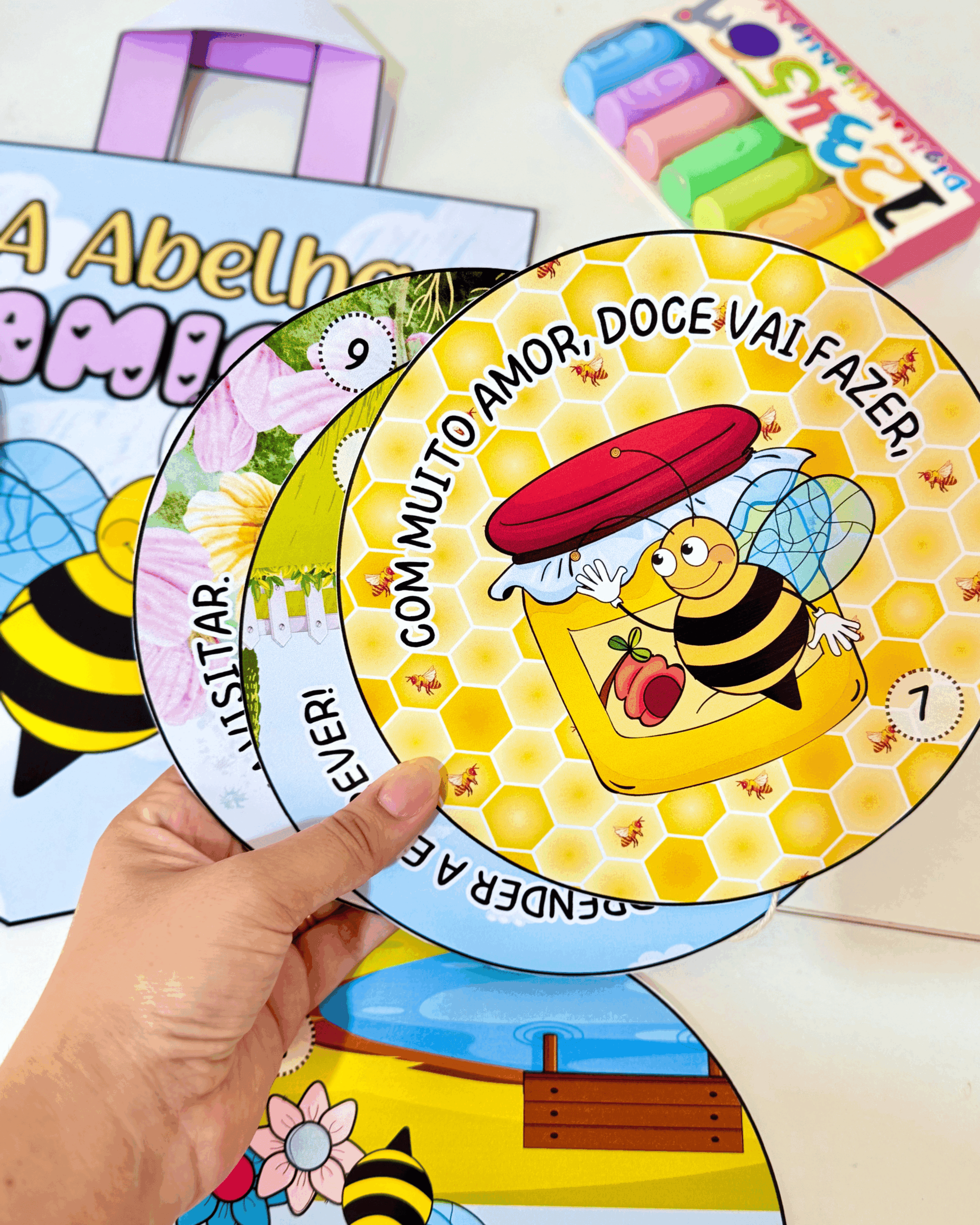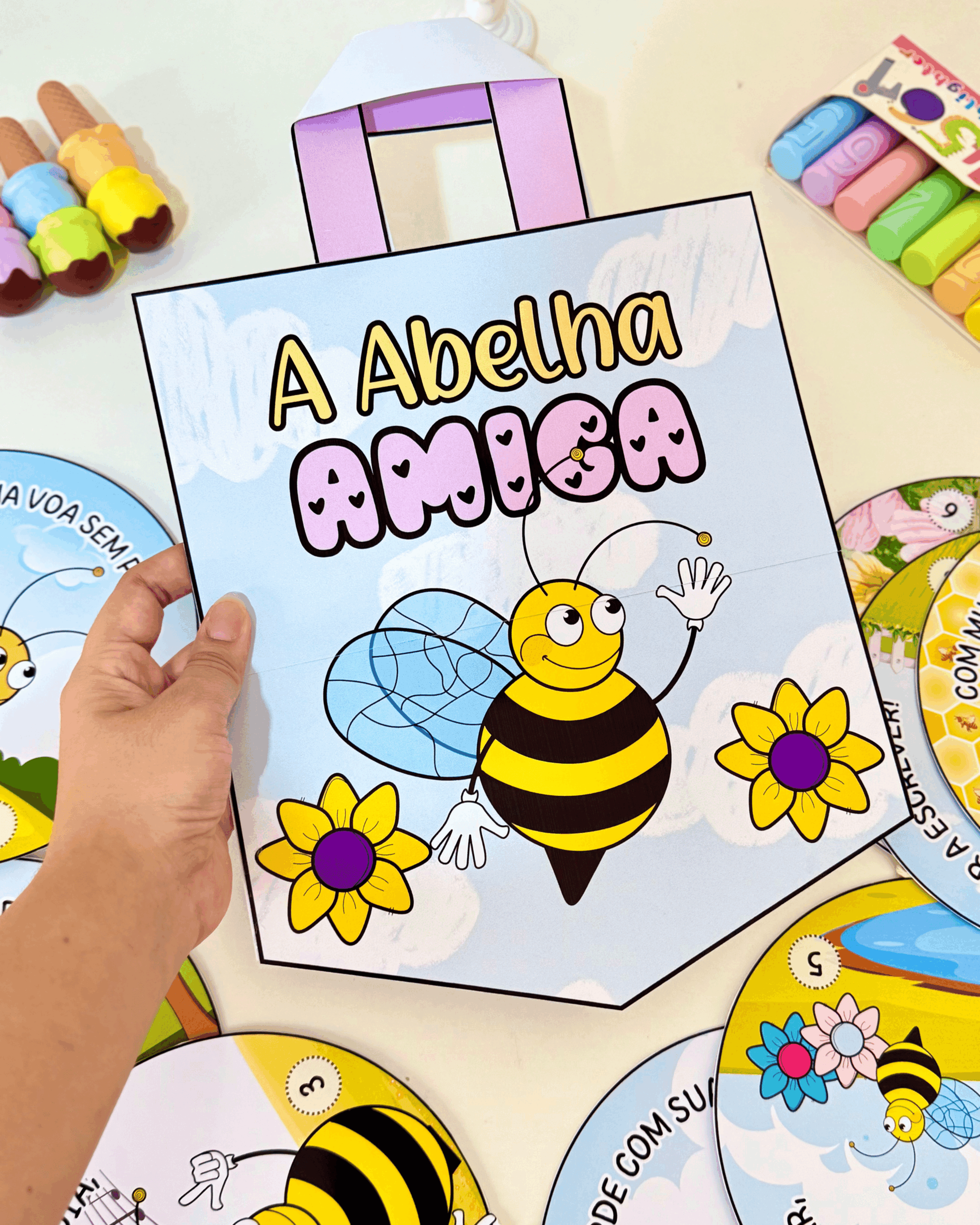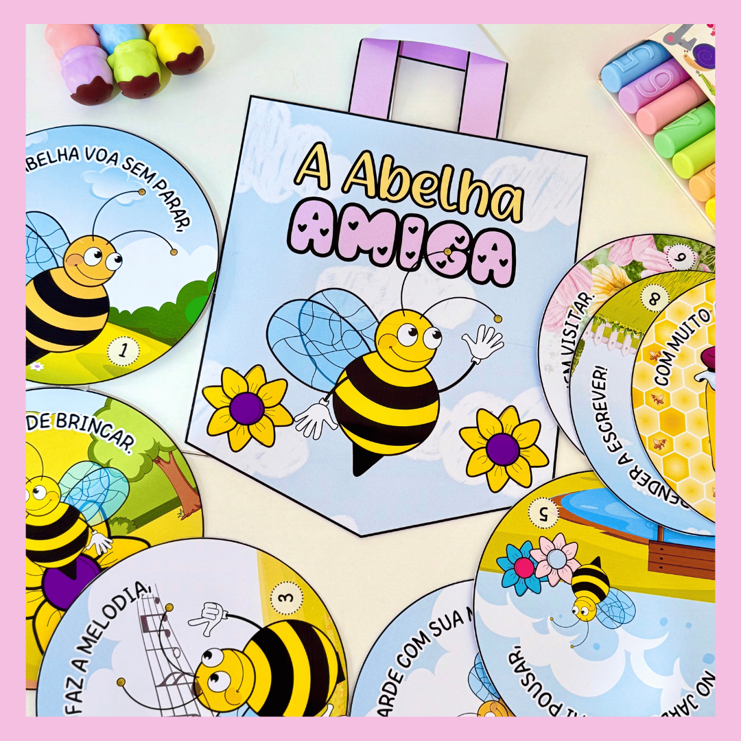 ✅ O material vai com a sacola e a história interativa “A Abelha Amiga” com 8 páginas rimadas.