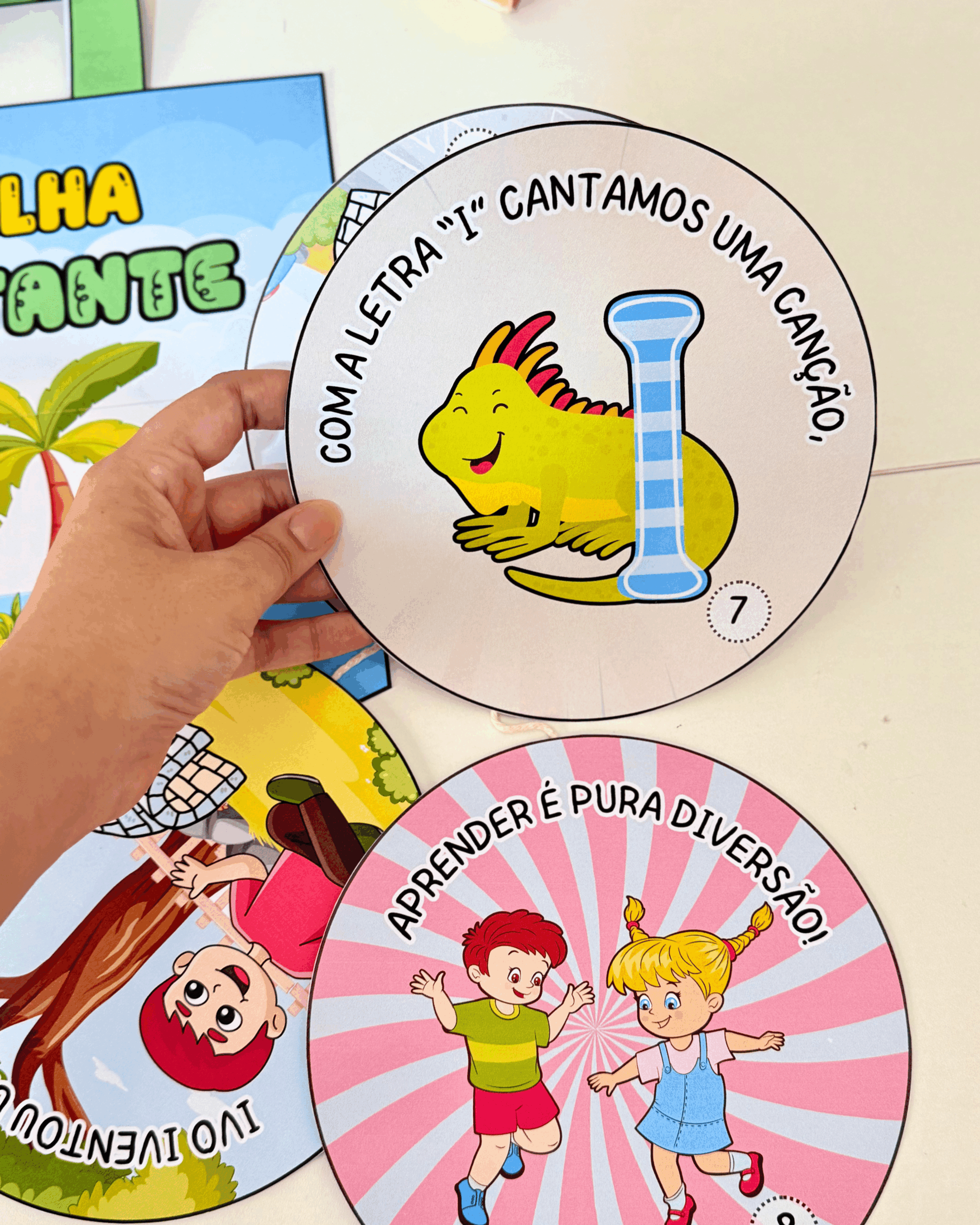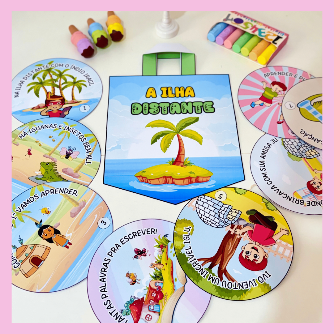 ✅ O material vai com a sacola e a história interativa “Ilha Distante” com 8 páginas rimadas.